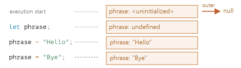 - 이때 변수의 상태는 특수 내부 상태(special internal state)인 'uninitialized’가 됩니다. 자바스크립트 엔진은 uninitialized 상태의 변수를 인지하긴 하지만, let을 만나기 전까진 이 변수를 참조할 수 없습니다.