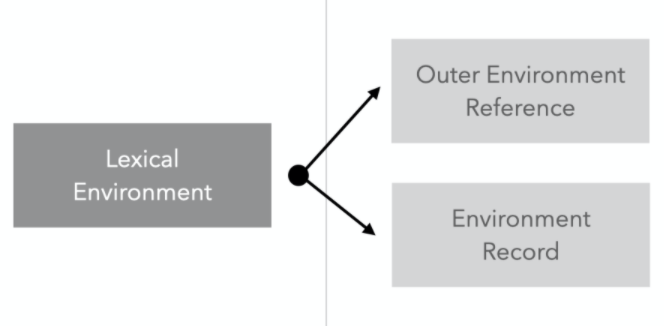 - LexicalEnvironment는 식별자들에 대한 정보를 담은 EnvironmentRecord와, 상위 LexicalEnvironment를 참조해 스코프 체인을 가능하게 하는 OuterEnvironmentReference 정보로 구성되어 있습니다.