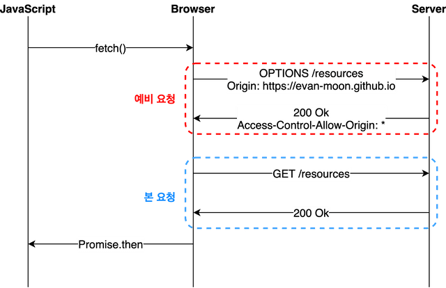 브라우저는 본 요청을 보내기 전 예비 요청을 먼저 보내고, 요청의 유효성을 검사하는데 우리가 자바스크립트의 fetch API를 사용하여 브라우저에게 리소스를 받아오라는 명령을 내리면 브라우저는 서버에게 예비 요청을 먼저 보내고, 서버는 이 예비 요청에 대한 응답으로 현재 자신이 어떤 것들을 허용하고, 어떤 것들을 금지하고 있는지에 대한 정보를 응답 헤더에 담아서 브라우저에게 다시 보내주게 됩니다.