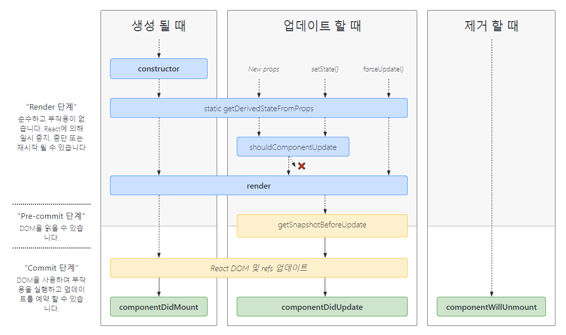 리액트에서 라이프사이클의 개념은 클래스 컴포넌트를 사용할 때 명확히 사용되는 부분인데 React 16.8 이후 리액트 훅(함수형 컴포넌트)의 개념이 등장하면서 생명주기의 개념도 이전처럼 명확하게 구분되어 사용되진 않습니다.