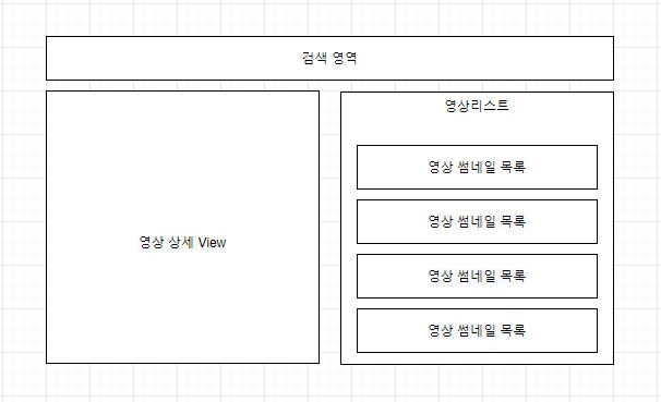 위 그림은 제가 예시로 만든 영상 목록 화면입니다. 그림에서 보면 컴포넌트로 구분할 수 있는 곳은 검색 영역, 영상 상세 view, 영상 리스트, 영상 썸네일 목록 이렇게 4개로 각각 구분될 수 있을 거 같아요. 값이 변하지 않는 곳은 컴포넌트로 분리하지 않아도 무방하고 컴포넌트로 구분하는 부분은 개발을 진행하는 담당자가 판단하에 정하는 게 좋을 것 같습니다.