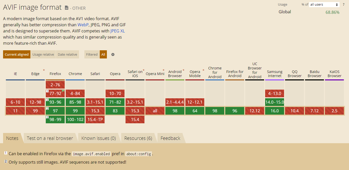 AVIF 또는 WEBP와 같은 최신 파일 형식은 여러 가지 장점이 있지만, 브라우저에서 지원되지 않을 수 있습니다. 특정 파일 형식을 지원하지 않는 경우 IMG에서 선언한 이미지가 노출됩니다. 코드를 작성할 때 브라우저가 원하는 값과 첫 번째 선언된 source의 속성 값이 일치한다면 브라우저는 해당 이미지를 노출한 후 그다음에 선언된 source 요소들은 무시하게 되므로 source 요소를 선언할 때는 순서에 유의하며 코드를 작성해야 합니다.
