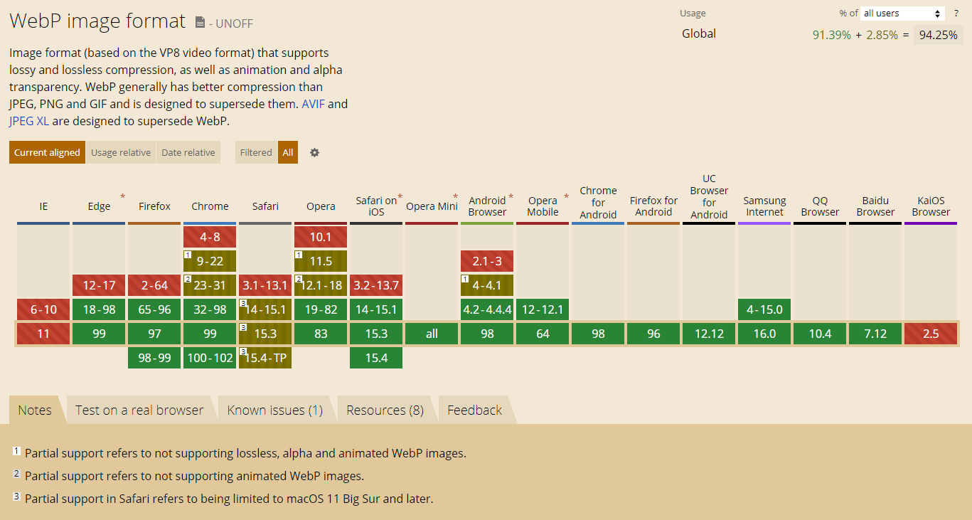현재 Webp는 모든 브라우저에서 지원하고 있지 않고 애니메이션 이미지의 경우 GIF보다 CPU 사용량이 더 높습니다.