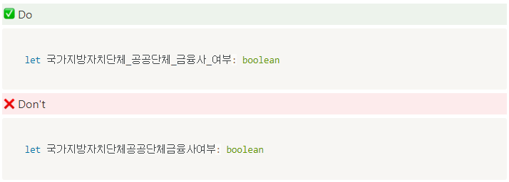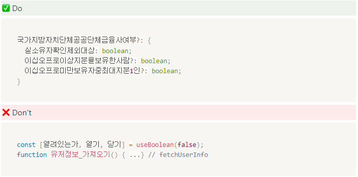 - 영문/한글 혼용은 지양하며 단순 음차하는 방식이더라도 이해가 더 쉽다면 적용한다.