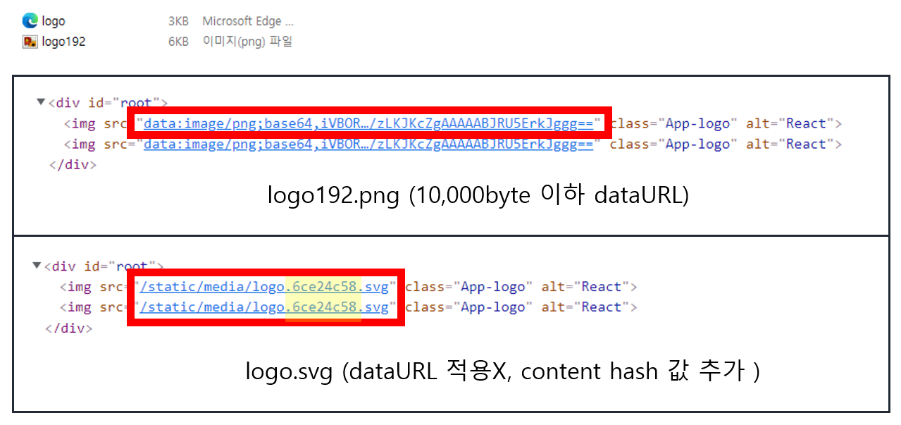import 와 require 방식의 차이가 있을까 궁금하여 두 개의 img를 비교해 보았습니다. 두 방식의 차이는 없었지만, logo192.png 파일의 경우 10,000byte 이하여서 dataURL이 리턴된 것을 확인할 수 있었고, logo.svg 파일로 테스트했을 경우에 파일명 뒤에 동일한 content hash 값을 확인할 수 있었습니다.